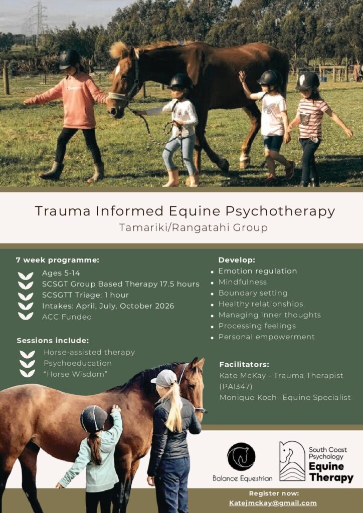 If you have an approved ACC Sensitive Claim, ACC provides adjacent group therapy in addition to your individual therapy. South Coast Psychology provides a range of Group Therapy programmes such as trauma-informed yoga, Dialectical Behaviour Therapy, and equine day retreats.
