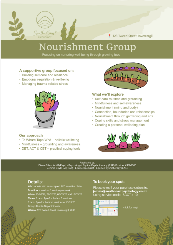 If you have an approved ACC sensitive claim – ACC provides in addition to your individual therapy an extra 32h each year for adjacent group therapy.